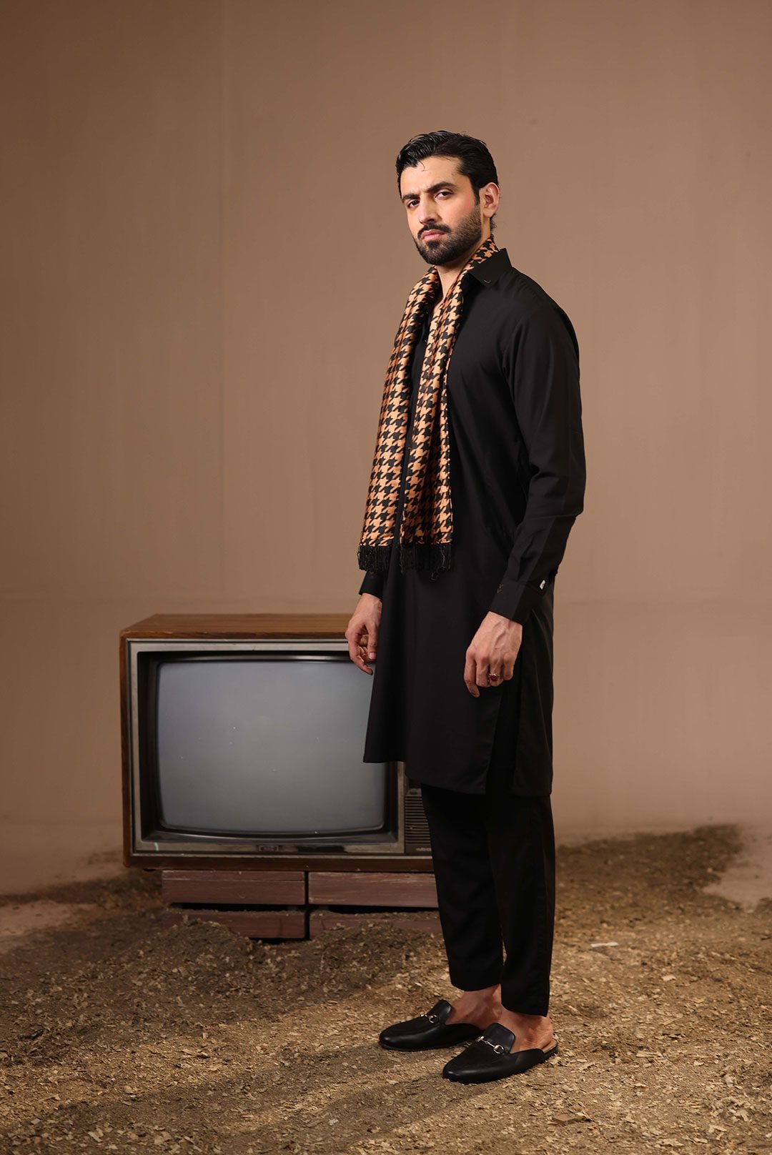 Make a statement in this sleek black kameez shalwar, masterfully tailored with intricate stitching . Blending classic tradition with contemporary comfort, it’s an ideal pick for effortless daily style or a refined festive appearance.