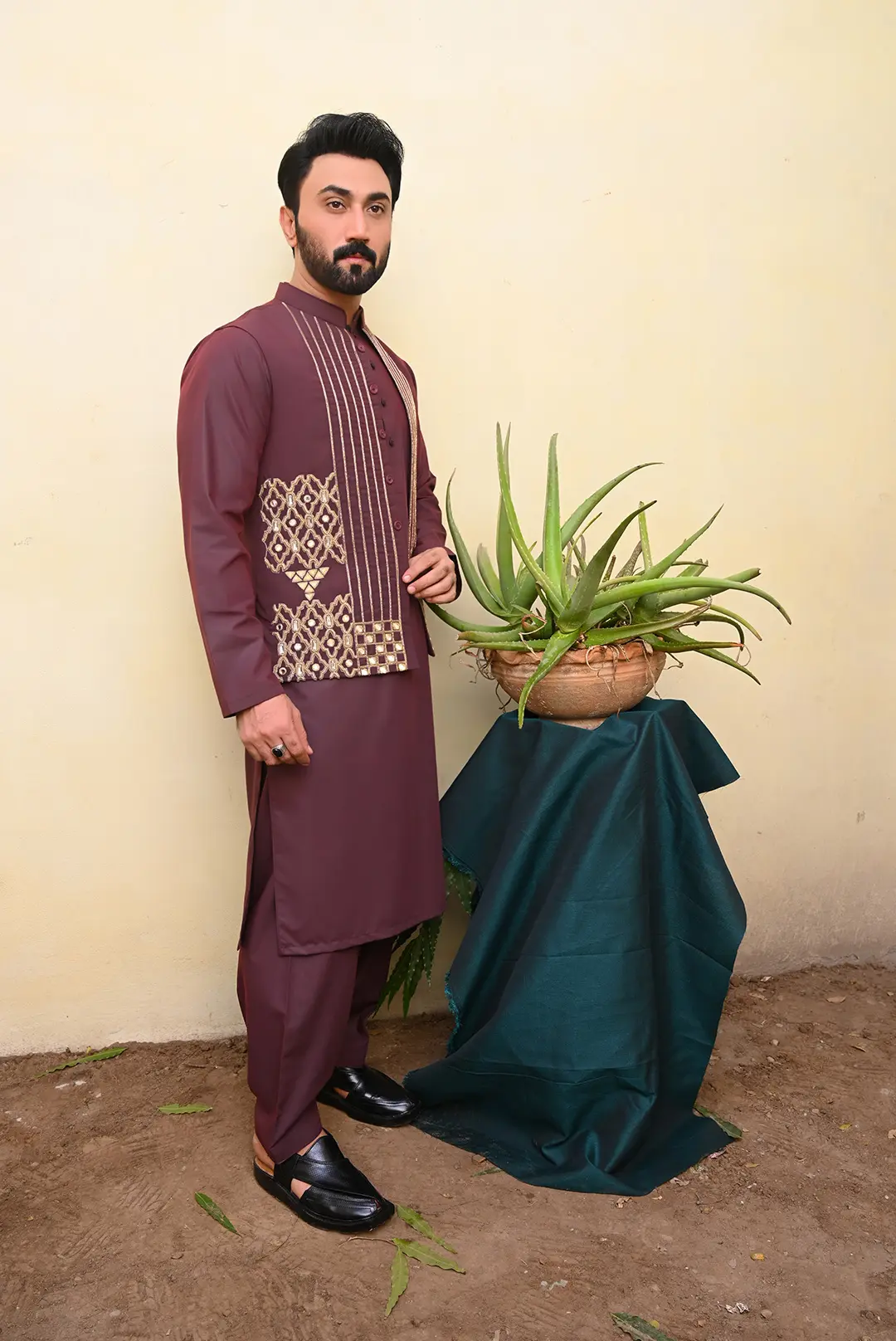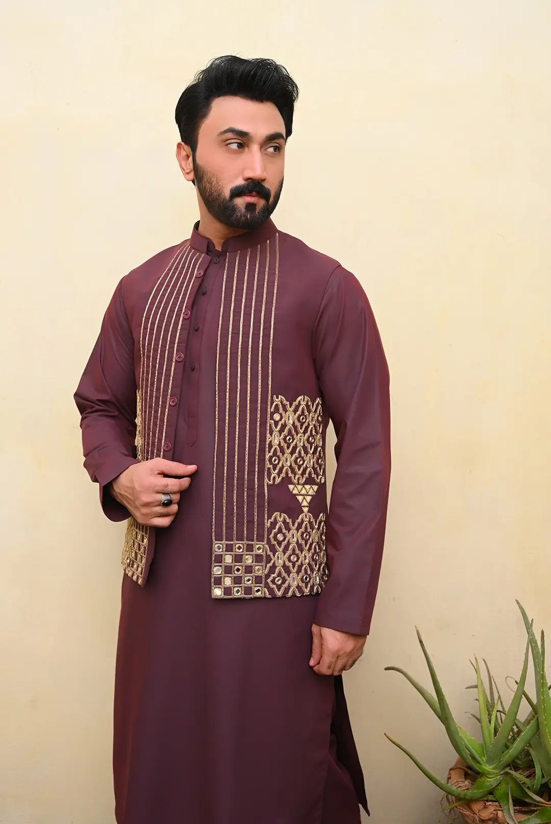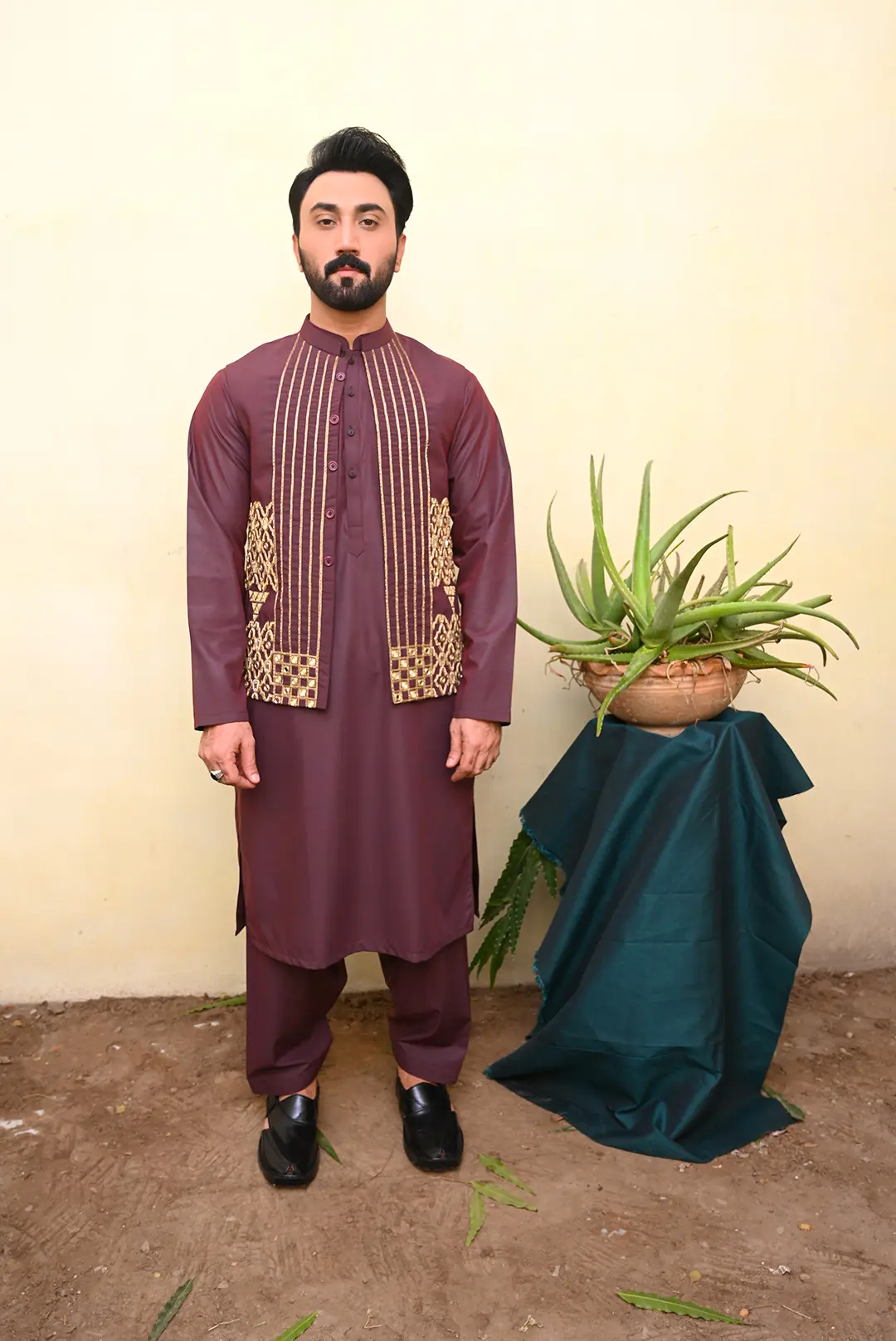 - Rich maroon waistcoat with intricate golden embellishments