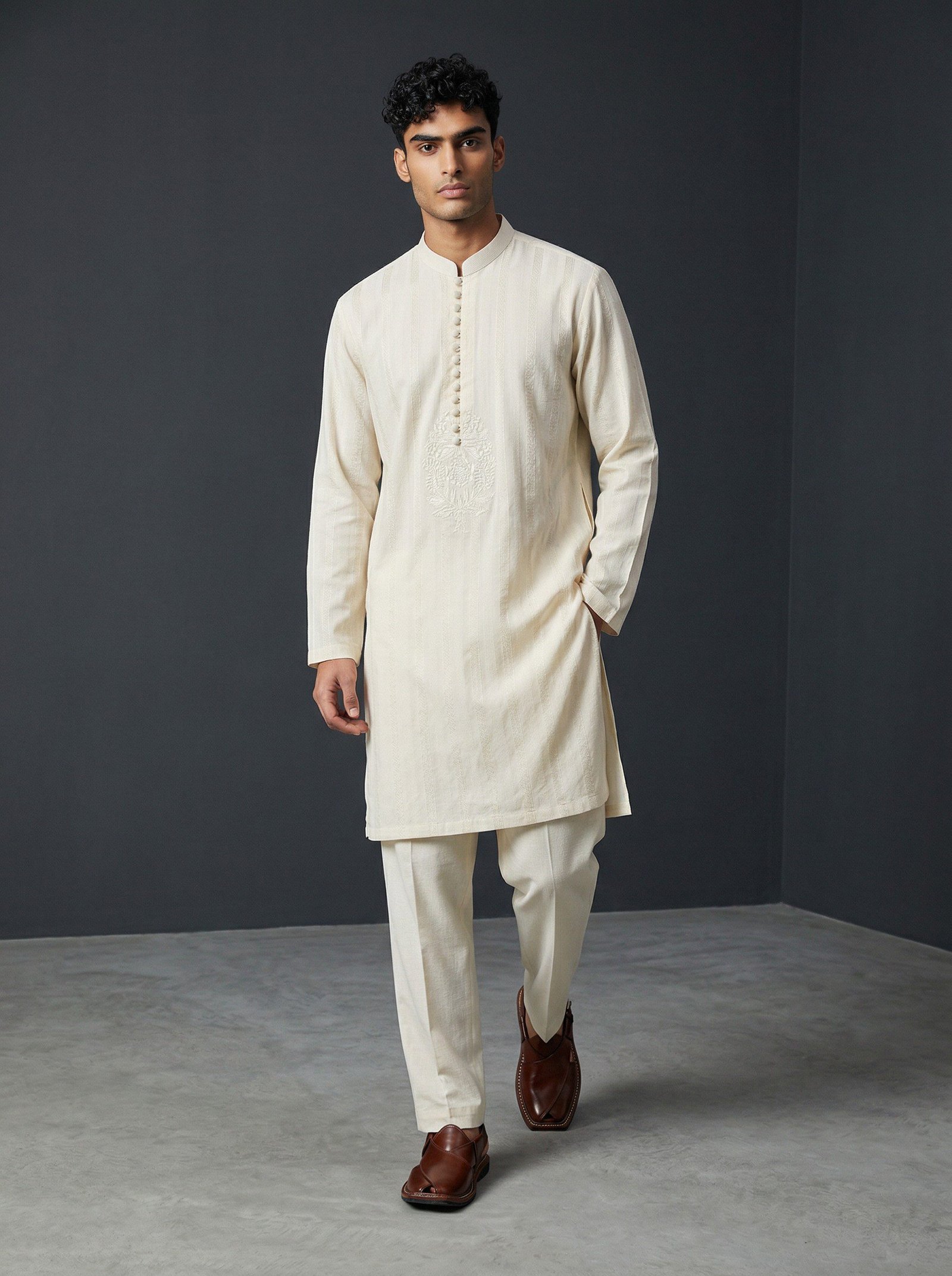 This timeless embroided suit features neat stitching and subtle details. Designed for comfort and style, it’s ideal for casual and light formal wear