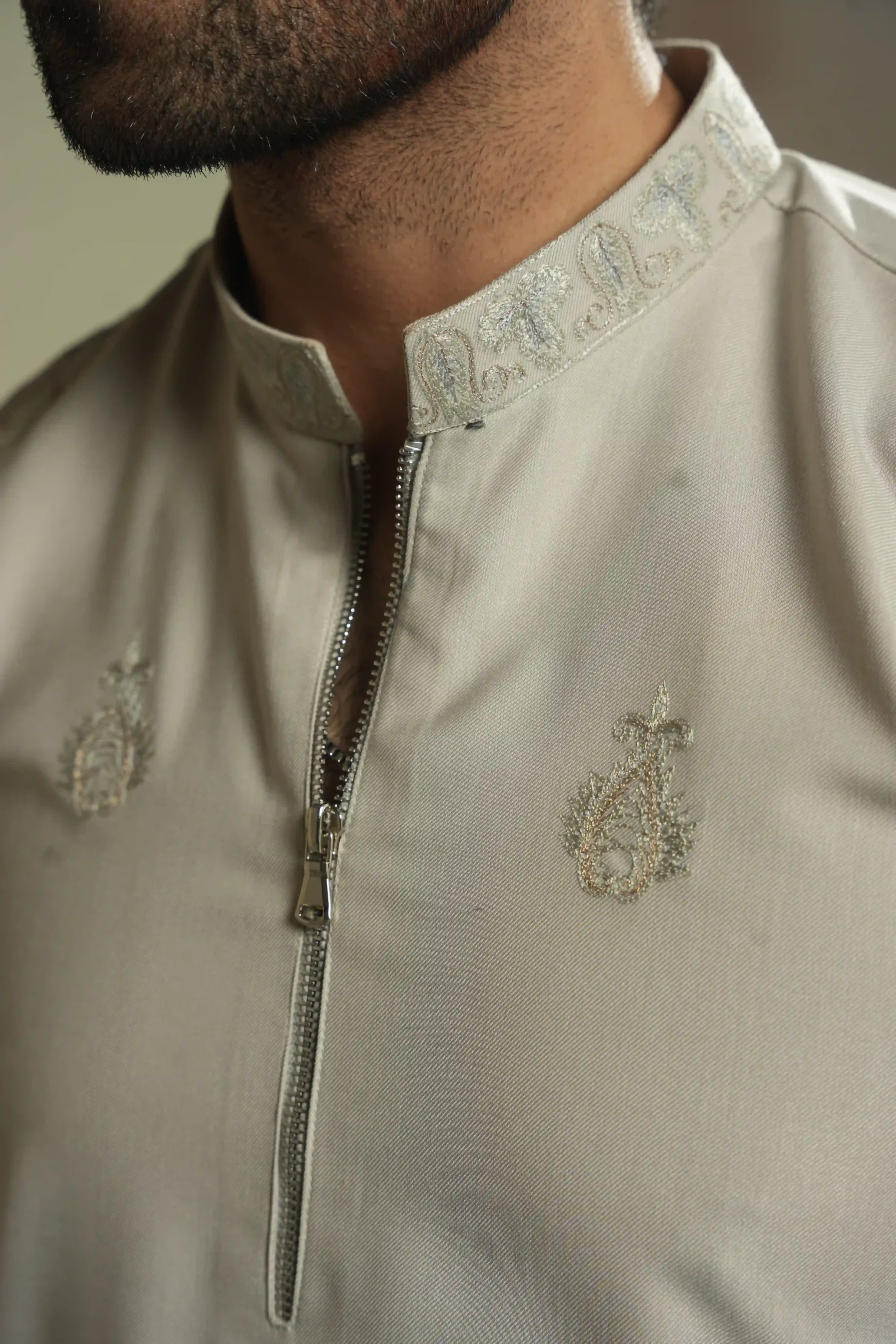 This set fixes the “stiff and boring” problem by combining elegant embroidery with a modern zipper and a comfortable wide-leg fit.