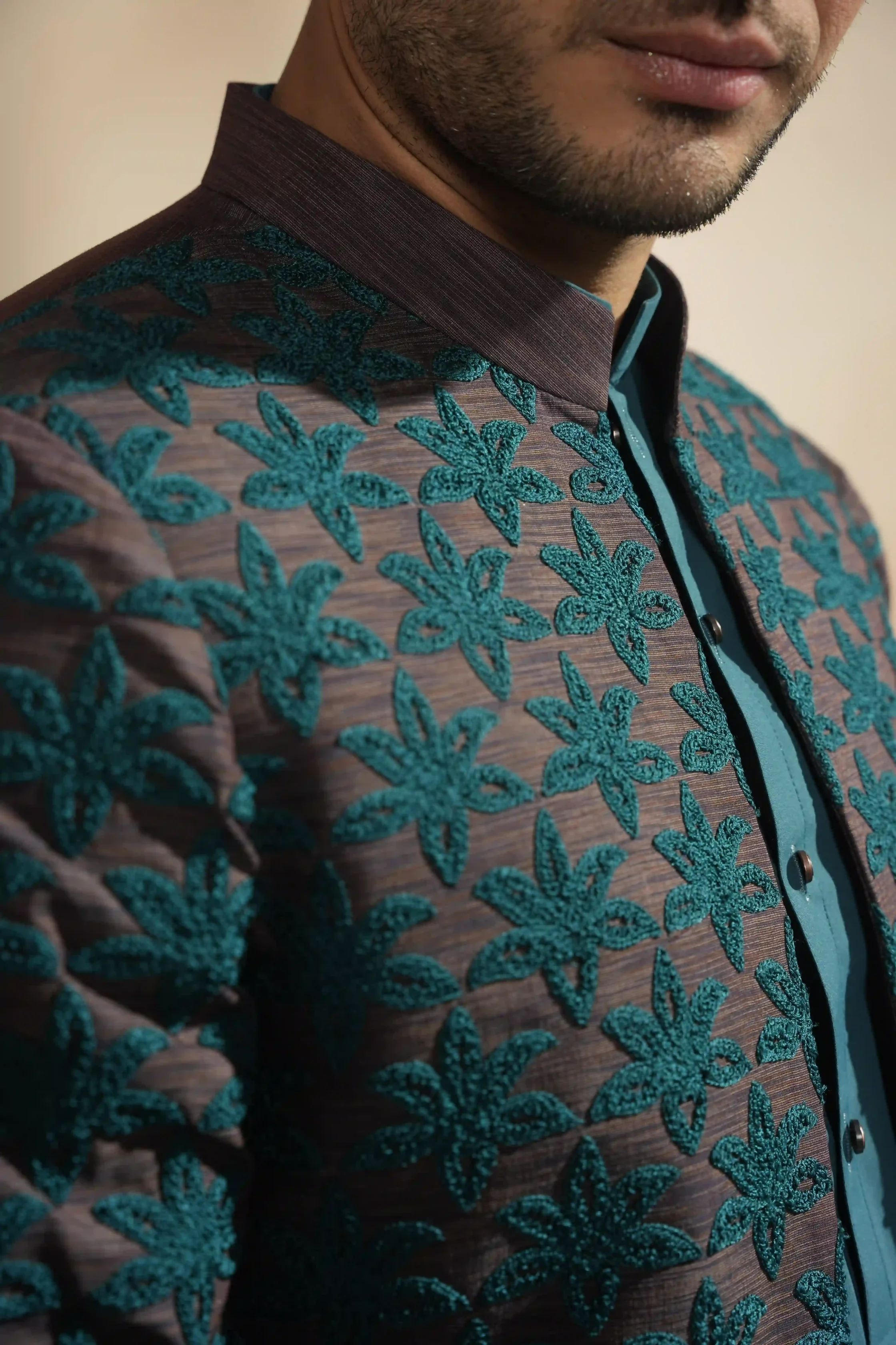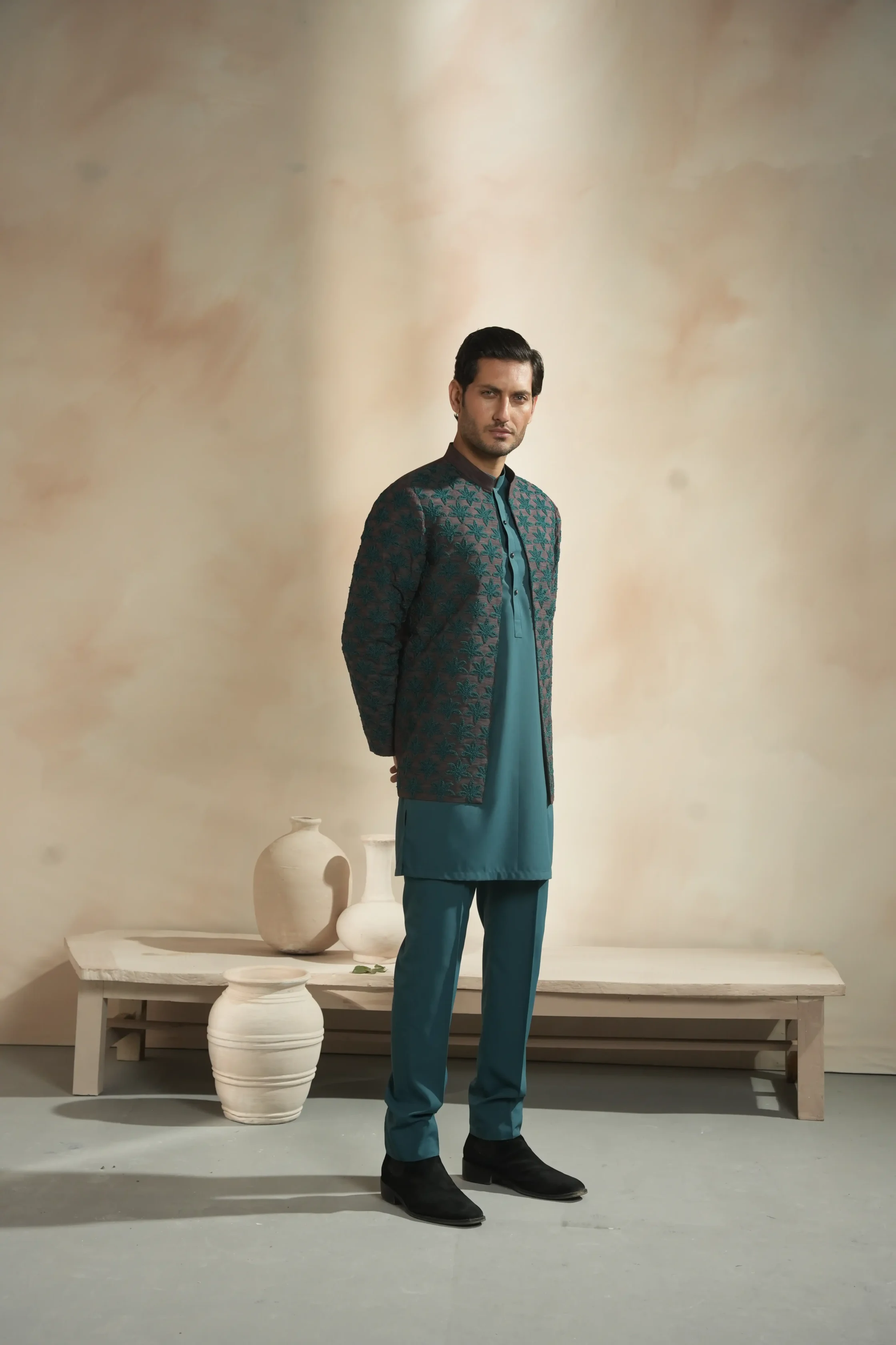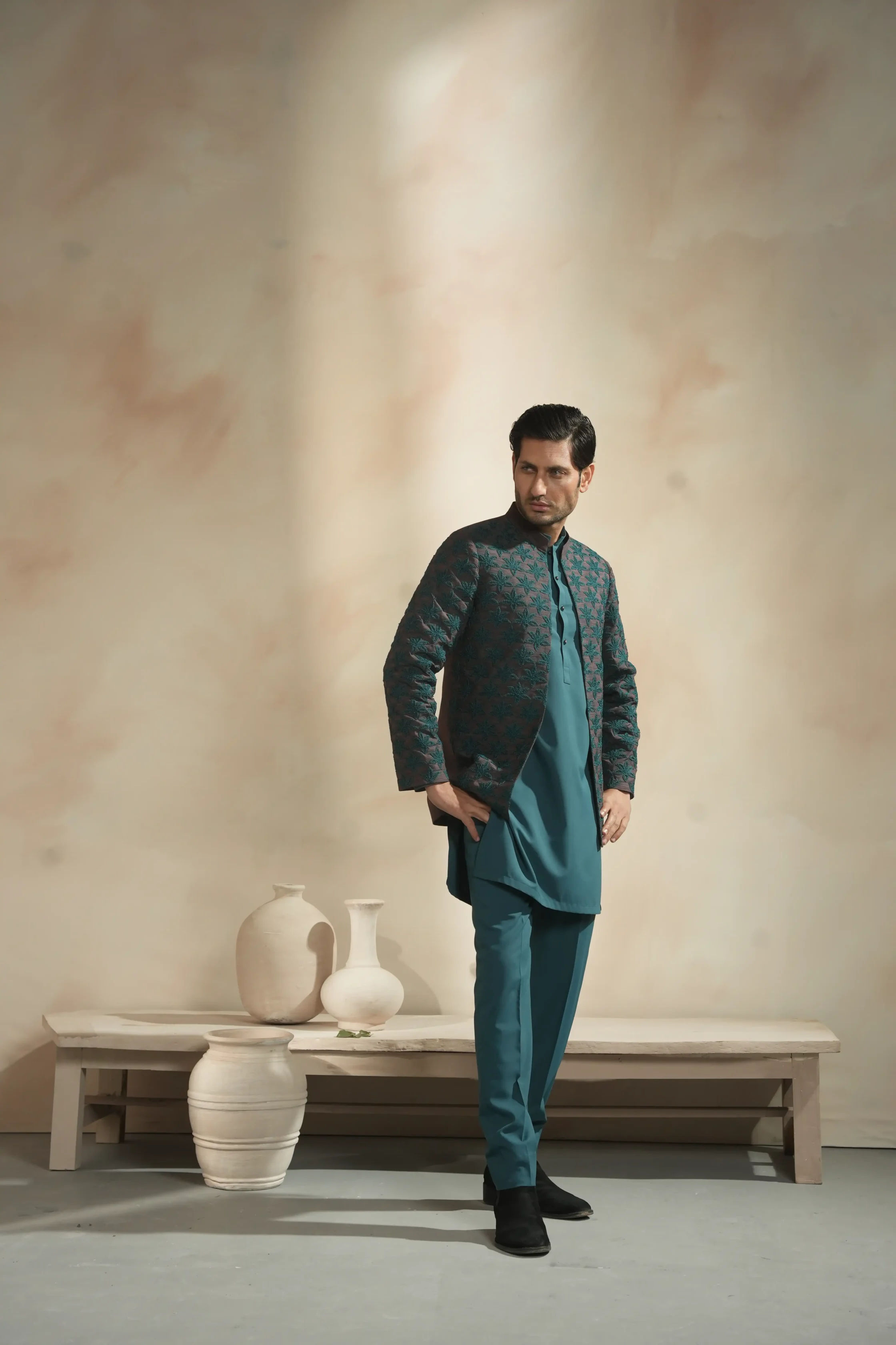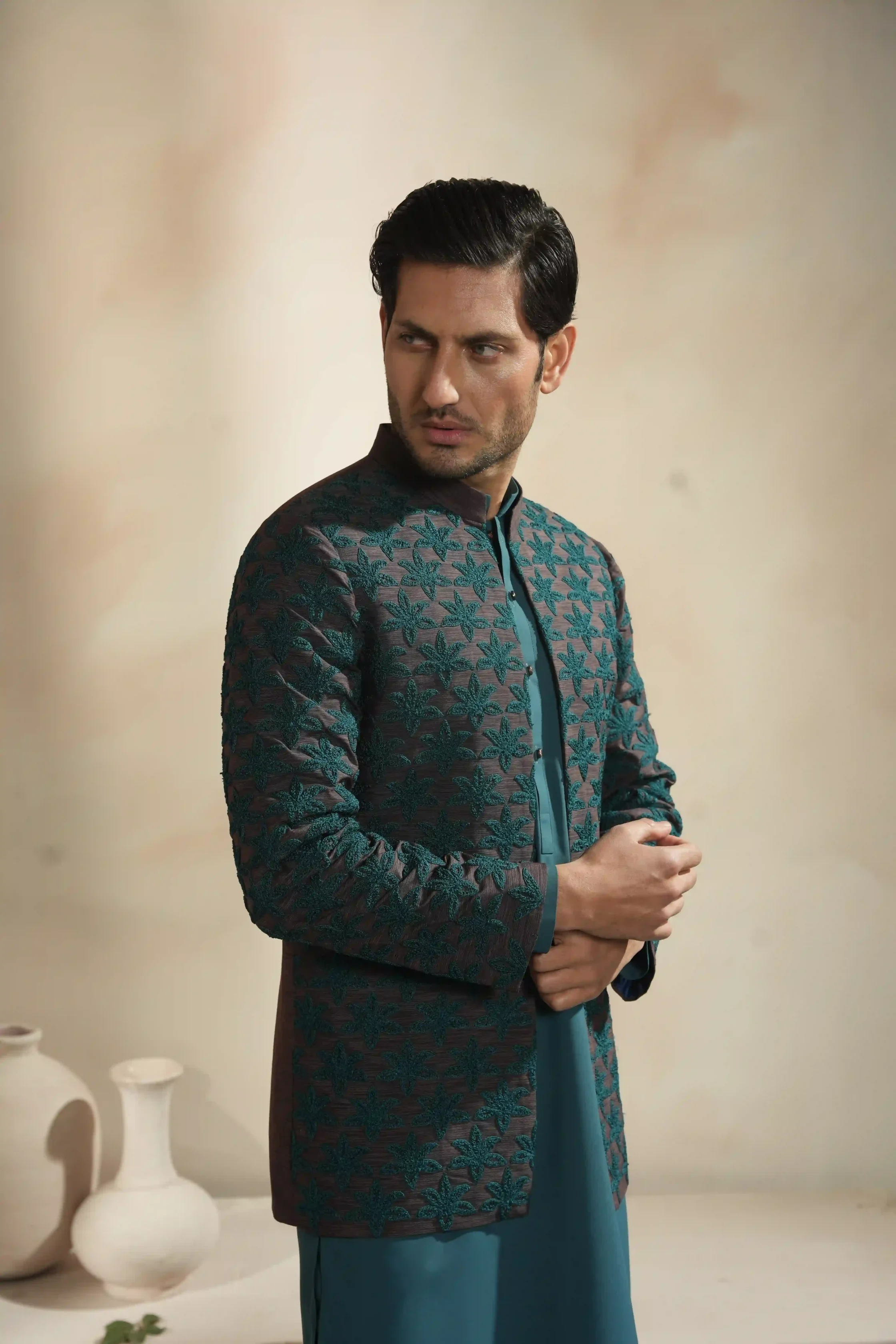 • A charcoal-teal Prince Coat featuring intricate star embroidery and sharp architectural tailoring for a commanding, heritage-inspired silhouette.